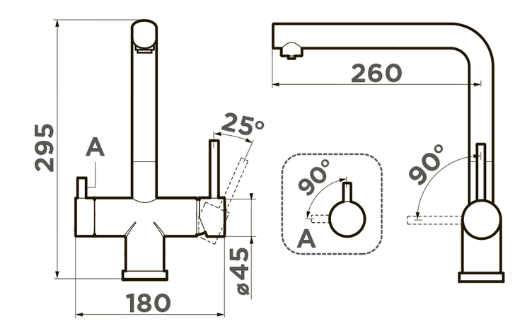 i Встроенная в кран насадка на длинном гибком шланге с металлической оплеткой. Насадки с кнопкой могут переключать обычный излив воды на душ.