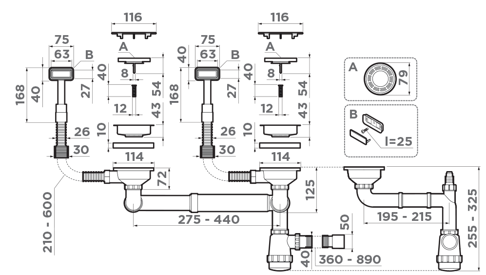 Omoikiri WK-2C-GB Арматура для двухчашевых моек с прямоугольными переливами, графит