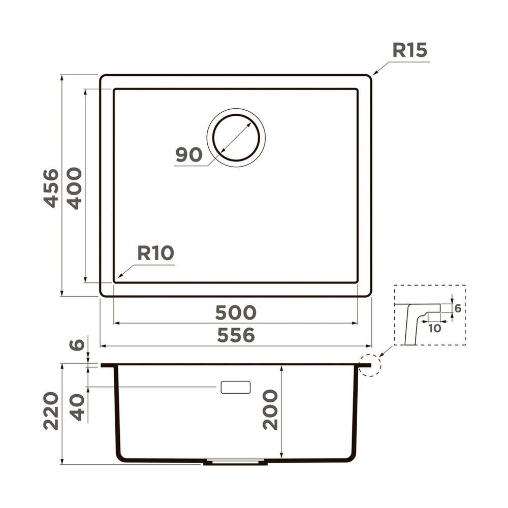 i Расстояние от дна до верхней кромки чаши мойки. Оптимальная глубина — 15-18 см. Чем глубже мойка, тем меньше брызг попадет наружу.