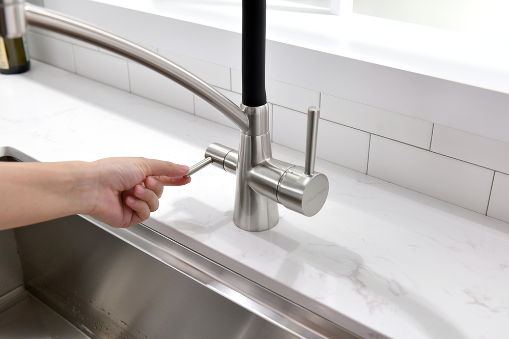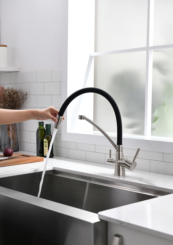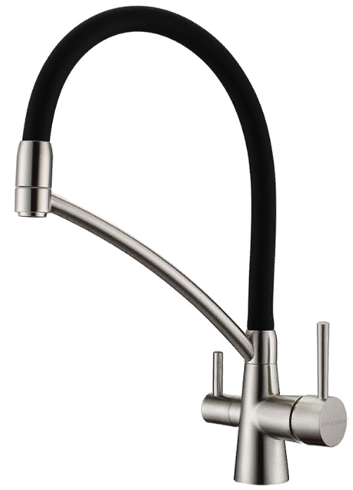 i Встроенная в кран насадка на длинном гибком шланге с металлической оплеткой. Насадки с кнопкой могут переключать обычный излив воды на душ.