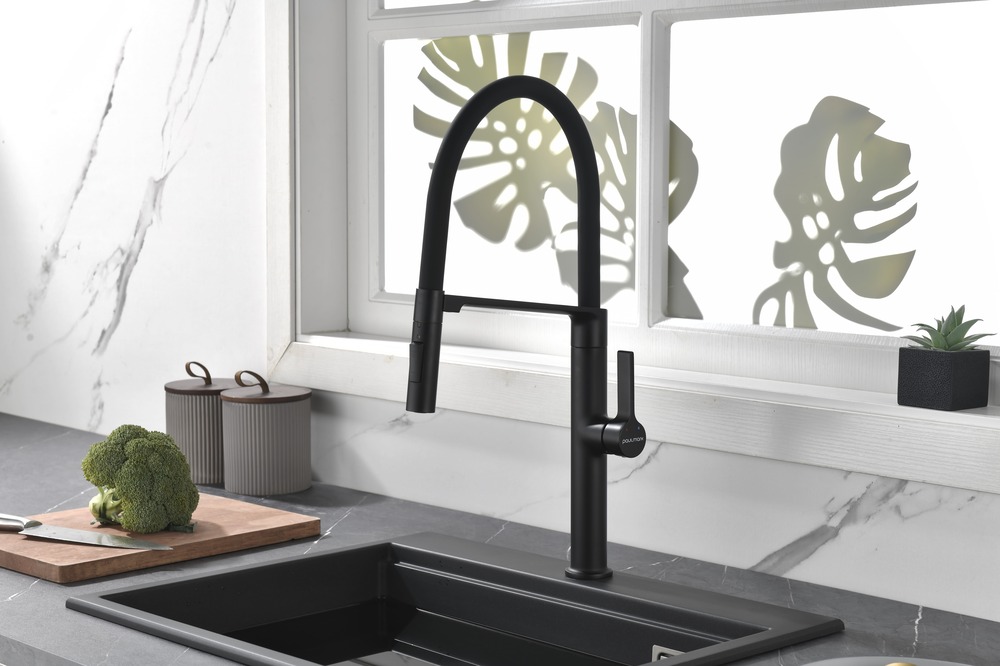 i Встроенная в кран насадка на длинном гибком шланге с металлической оплеткой. Насадки с кнопкой могут переключать обычный излив воды на душ.