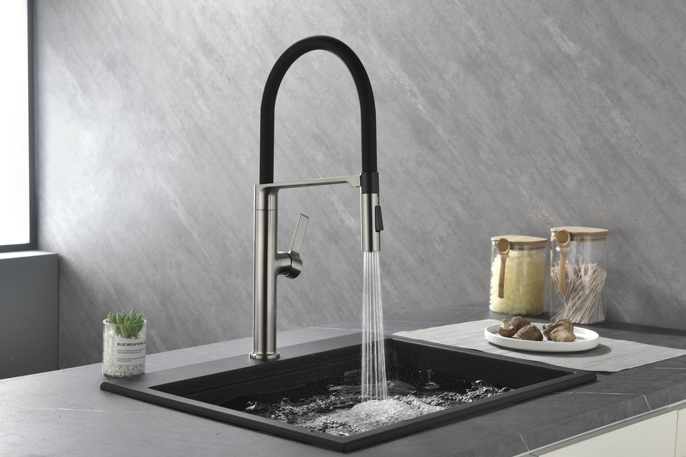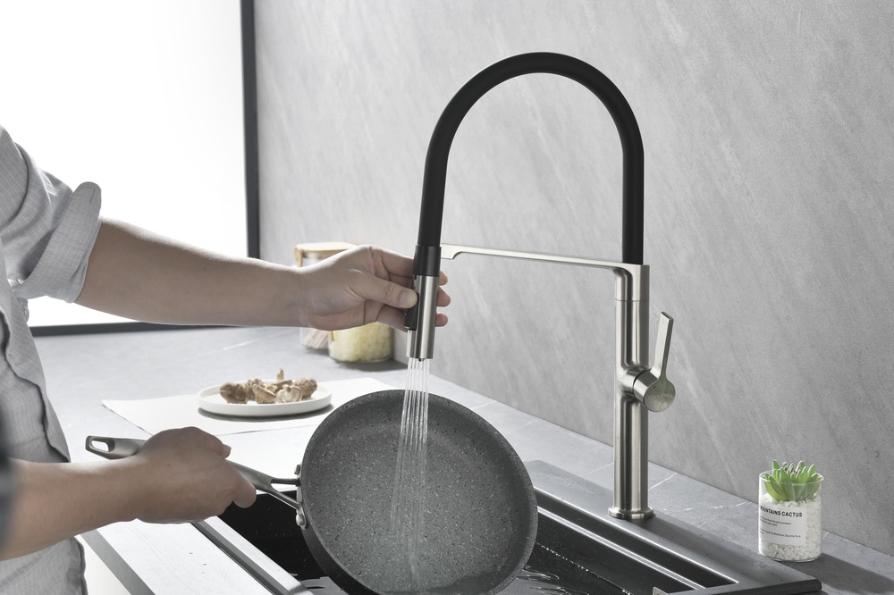 i Встроенная в кран насадка на длинном гибком шланге с металлической оплеткой. Насадки с кнопкой могут переключать обычный излив воды на душ.
