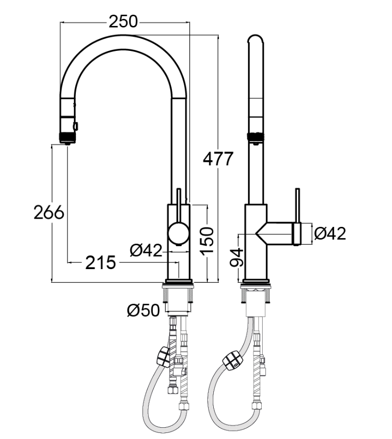 i Встроенная в кран насадка на длинном гибком шланге с металлической оплеткой. Насадки с кнопкой могут переключать обычный излив воды на душ.