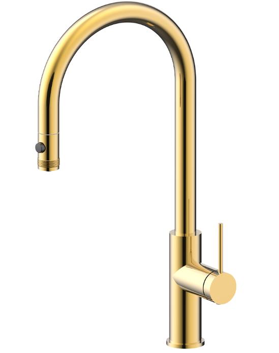 i Встроенная в кран насадка на длинном гибком шланге с металлической оплеткой. Насадки с кнопкой могут переключать обычный излив воды на душ.