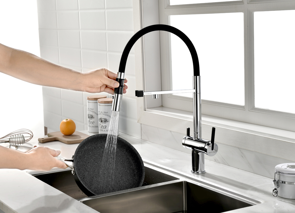 i Встроенная в кран насадка на длинном гибком шланге с металлической оплеткой. Насадки с кнопкой могут переключать обычный излив воды на душ.