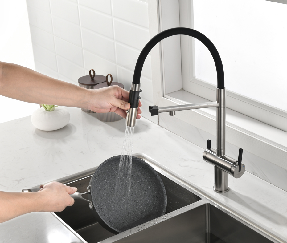 i Встроенная в кран насадка на длинном гибком шланге с металлической оплеткой. Насадки с кнопкой могут переключать обычный излив воды на душ.
