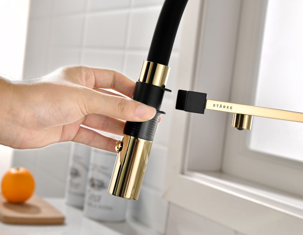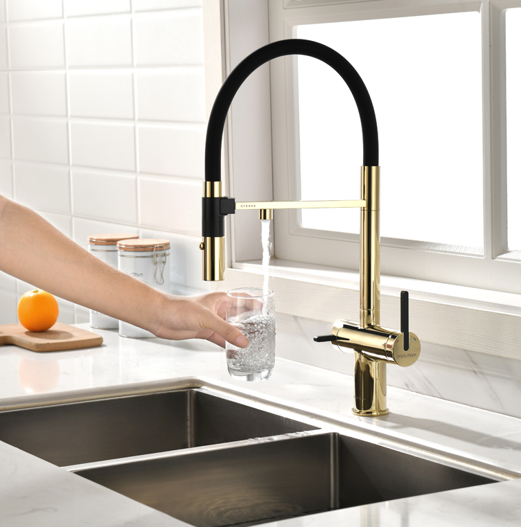 Paulmark GRAVITY, смеситель, золото, черный шланг
