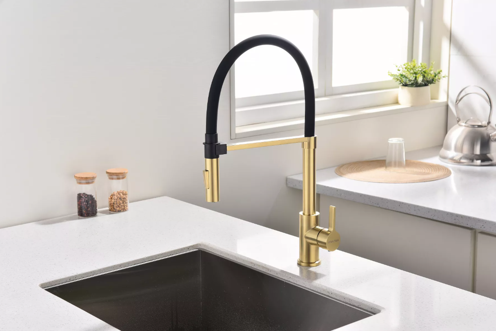 i Встроенная в кран насадка на длинном гибком шланге с металлической оплеткой. Насадки с кнопкой могут переключать обычный излив воды на душ.