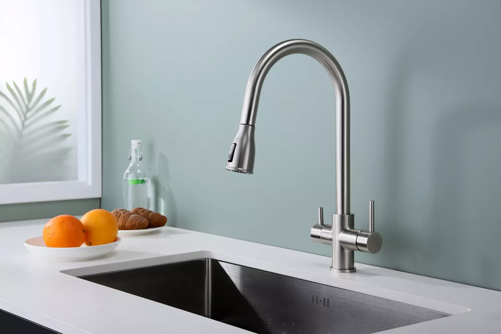 i Встроенная в кран насадка на длинном гибком шланге с металлической оплеткой. Насадки с кнопкой могут переключать обычный излив воды на душ.