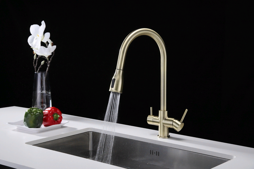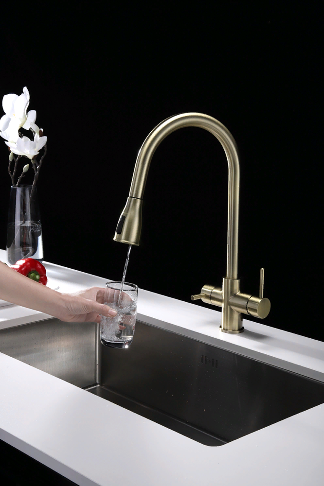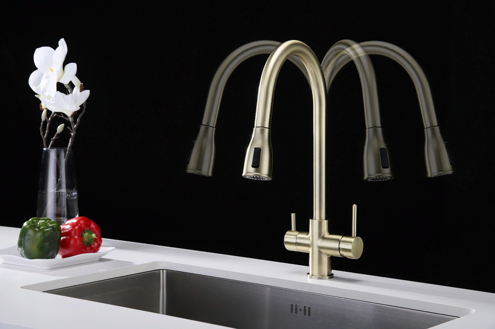 i Встроенная в кран насадка на длинном гибком шланге с металлической оплеткой. Насадки с кнопкой могут переключать обычный излив воды на душ.
