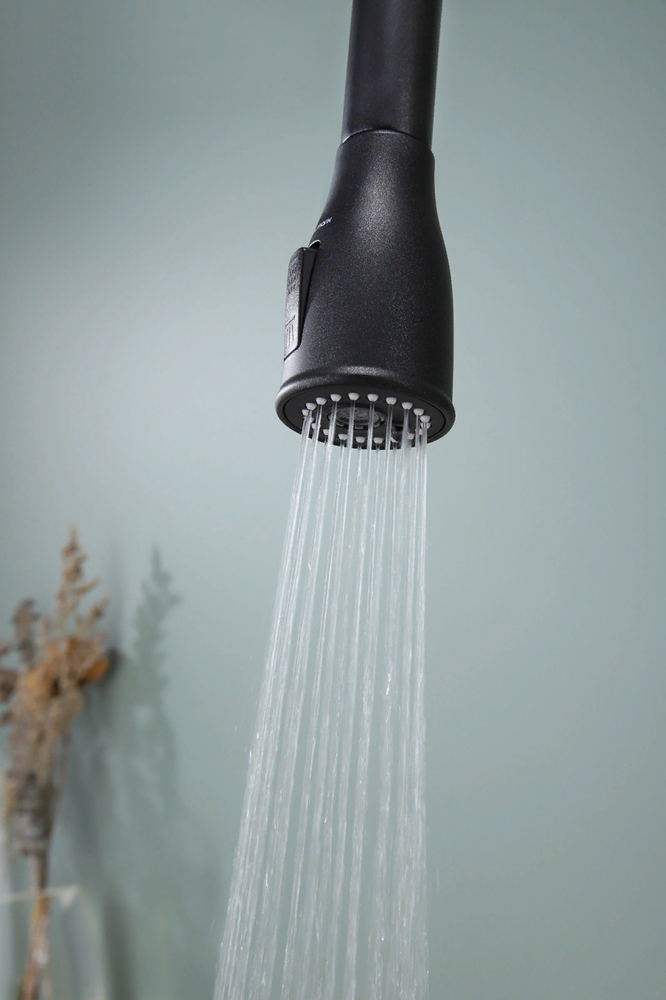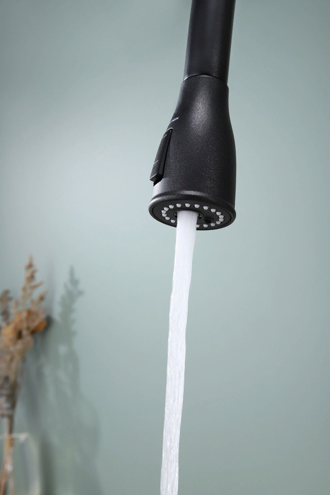 i Встроенная в кран насадка на длинном гибком шланге с металлической оплеткой. Насадки с кнопкой могут переключать обычный излив воды на душ.