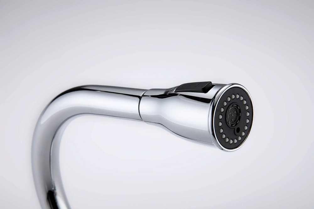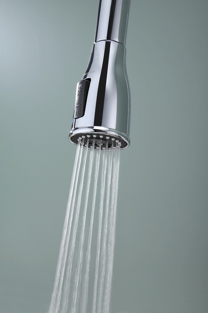 i Встроенная в кран насадка на длинном гибком шланге с металлической оплеткой. Насадки с кнопкой могут переключать обычный излив воды на душ.