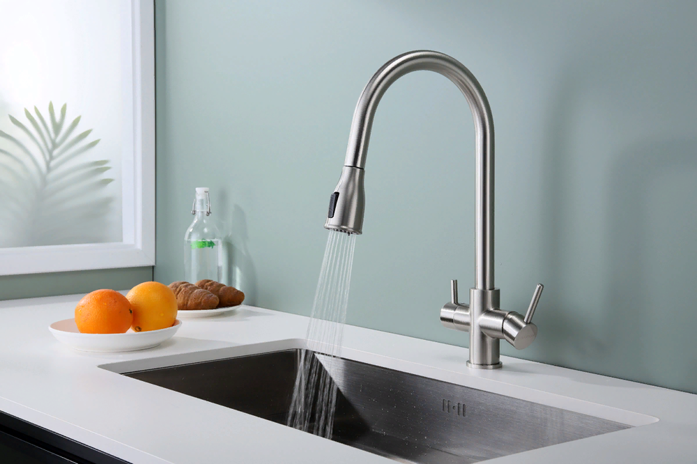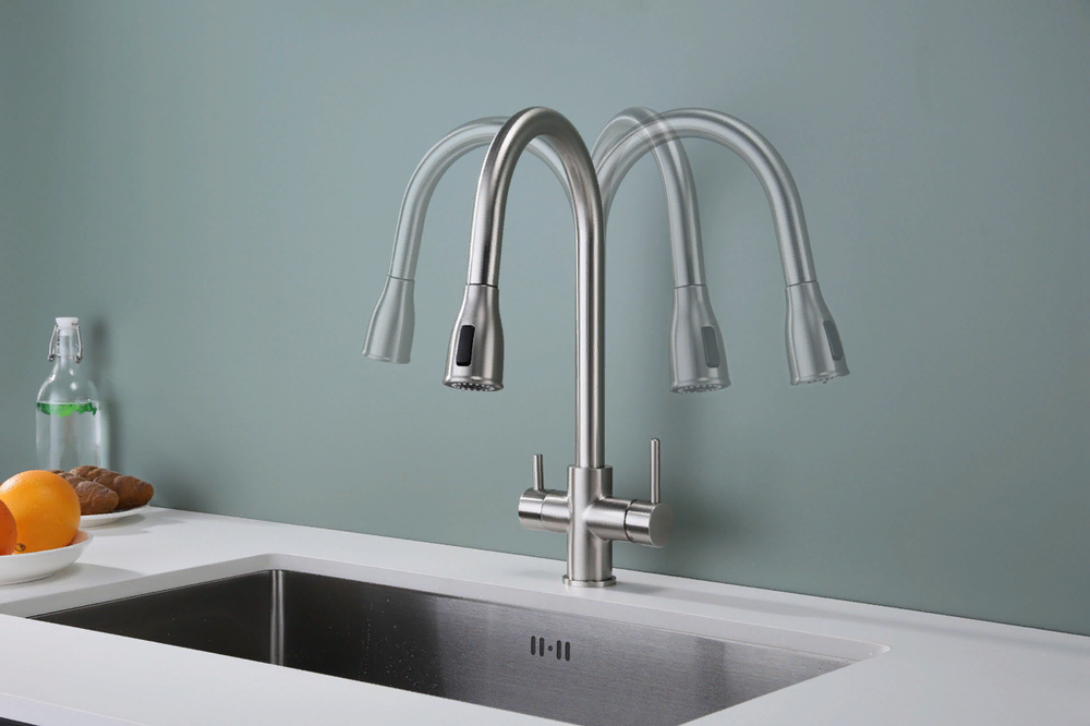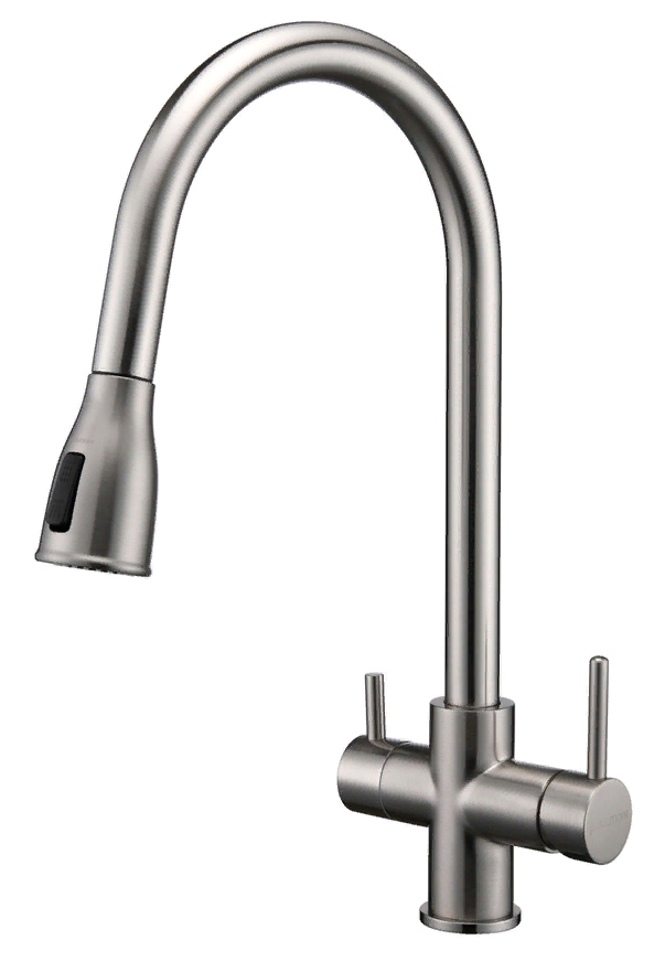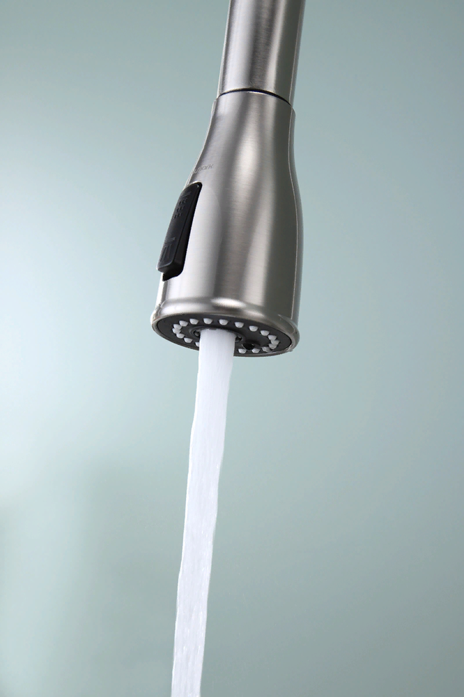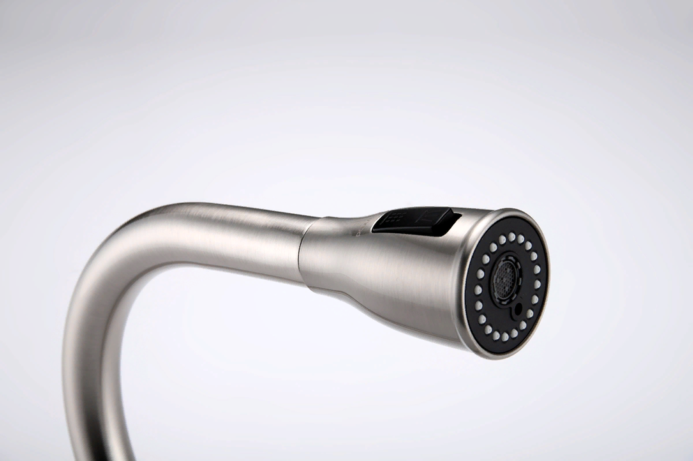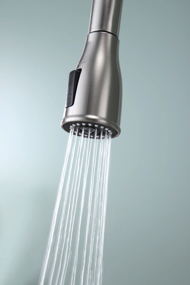 i Встроенная в кран насадка на длинном гибком шланге с металлической оплеткой. Насадки с кнопкой могут переключать обычный излив воды на душ.