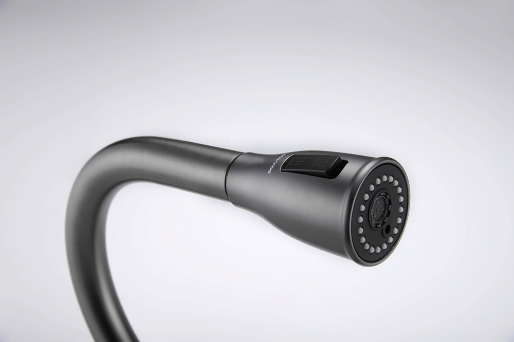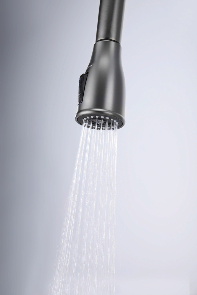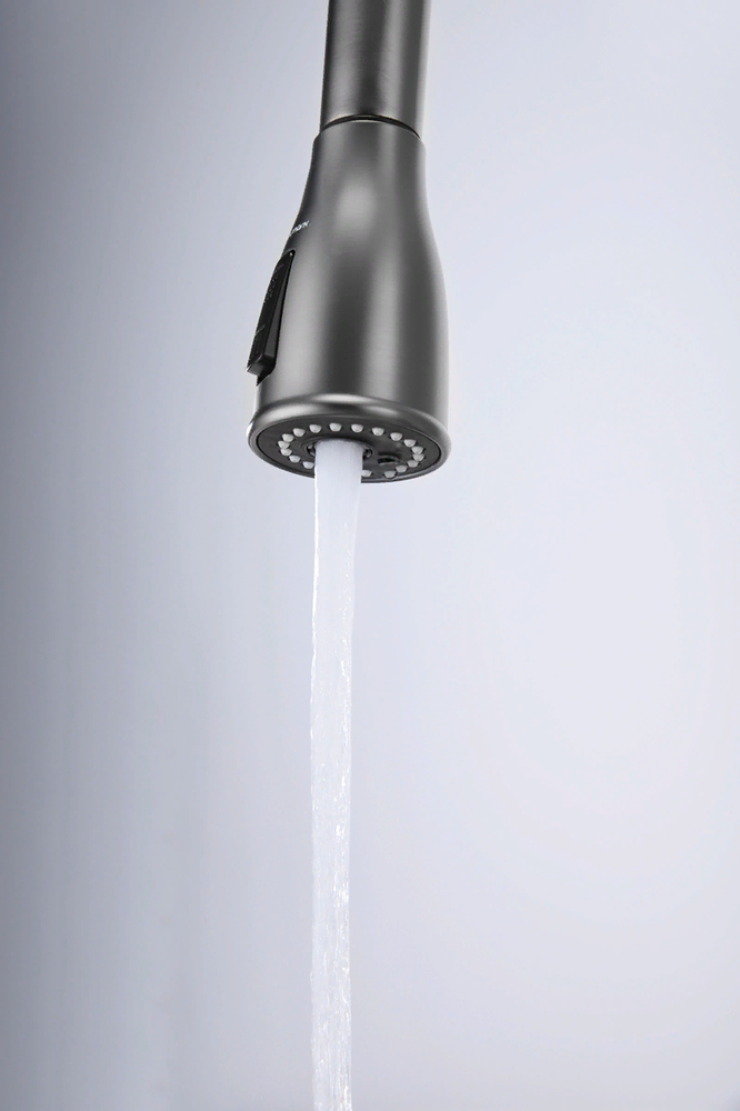 i Встроенная в кран насадка на длинном гибком шланге с металлической оплеткой. Насадки с кнопкой могут переключать обычный излив воды на душ.