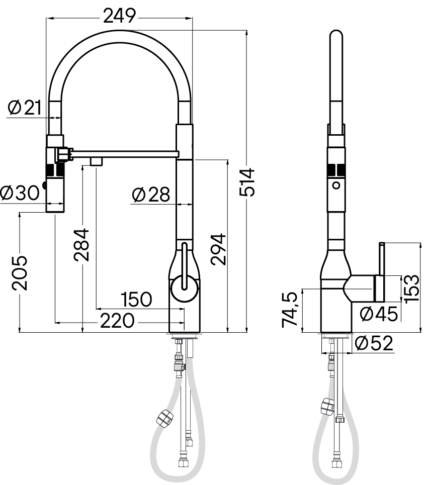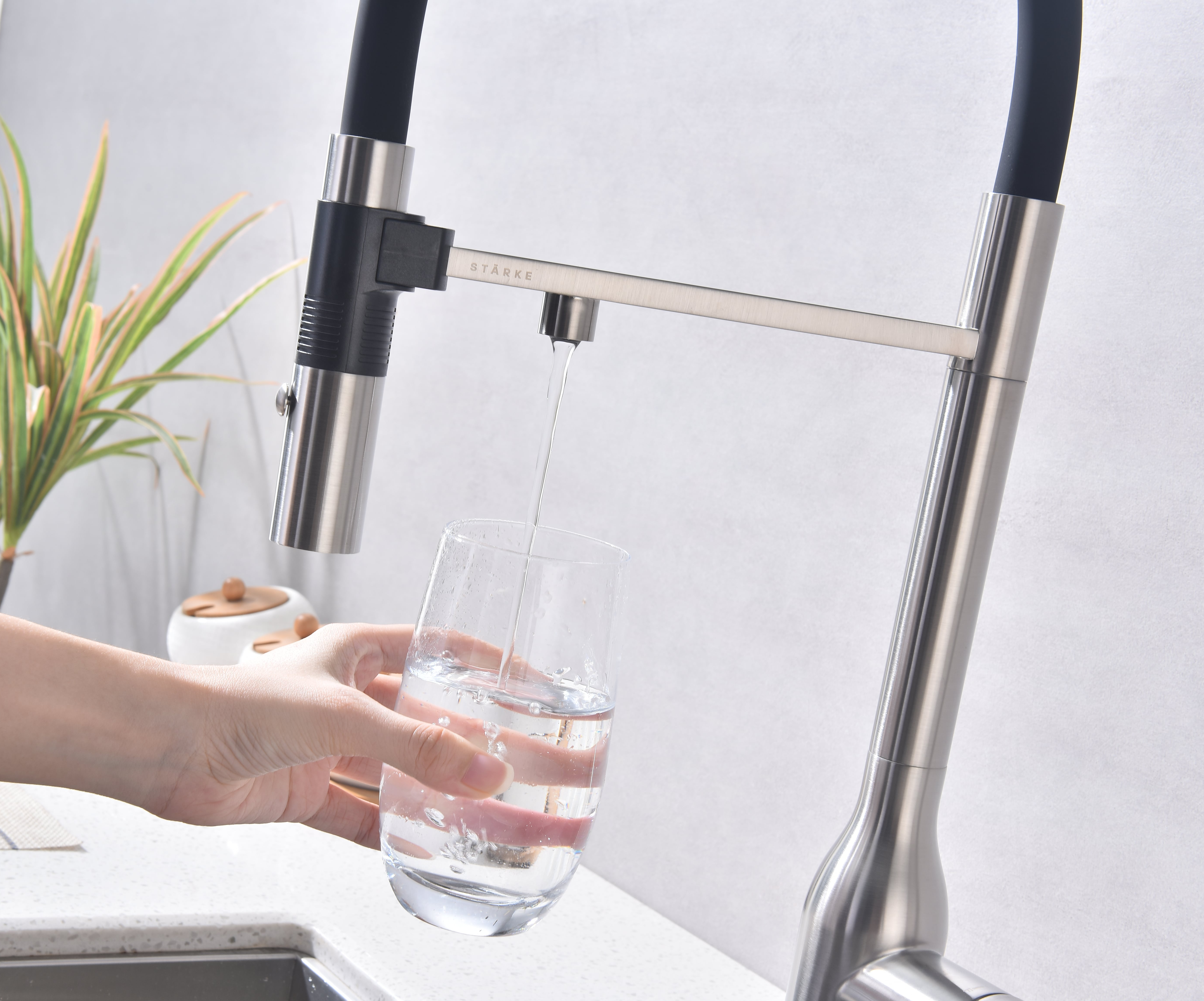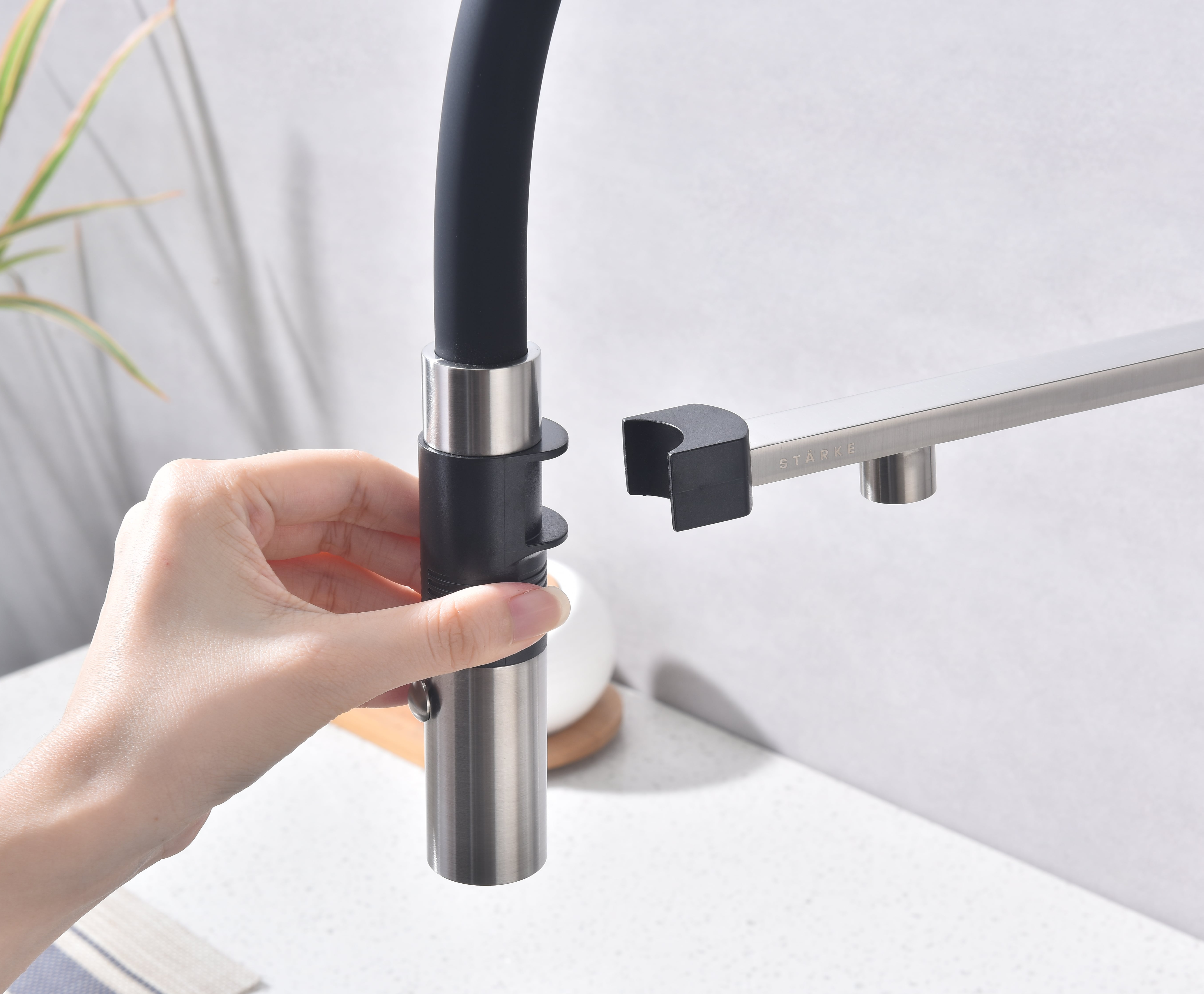 i Встроенная в кран насадка на длинном гибком шланге с металлической оплеткой. Насадки с кнопкой могут переключать обычный излив воды на душ.