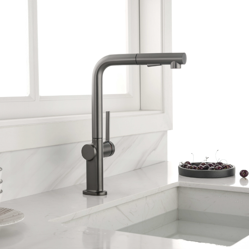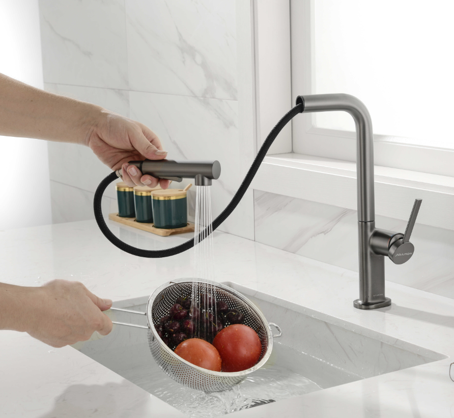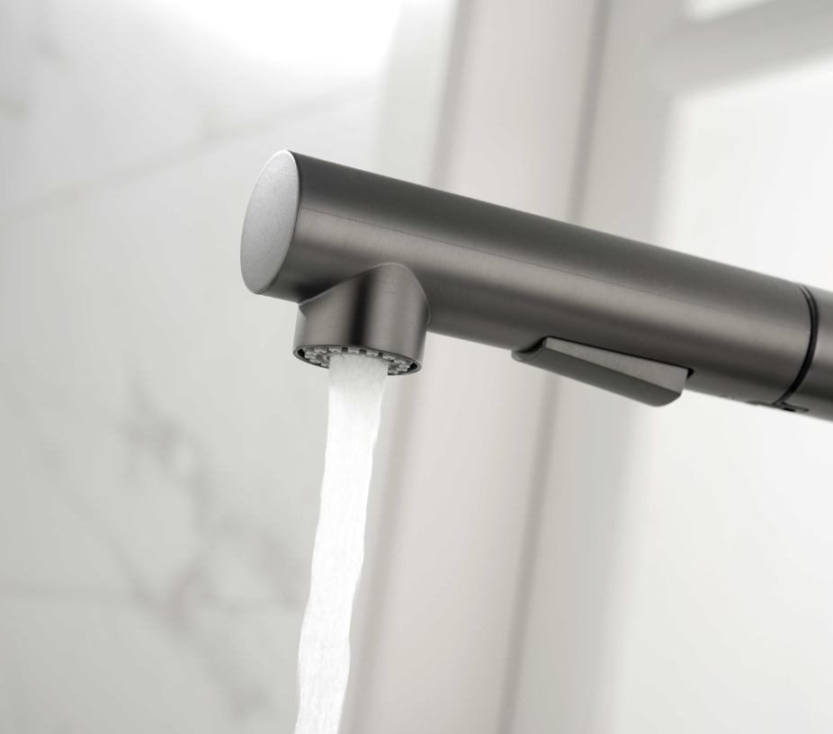 i Встроенная в кран насадка на длинном гибком шланге с металлической оплеткой. Насадки с кнопкой могут переключать обычный излив воды на душ.