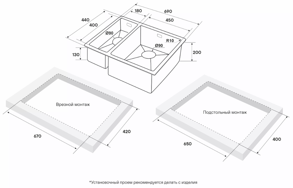 Монтажная длина х ширина (врезной / подстольный)