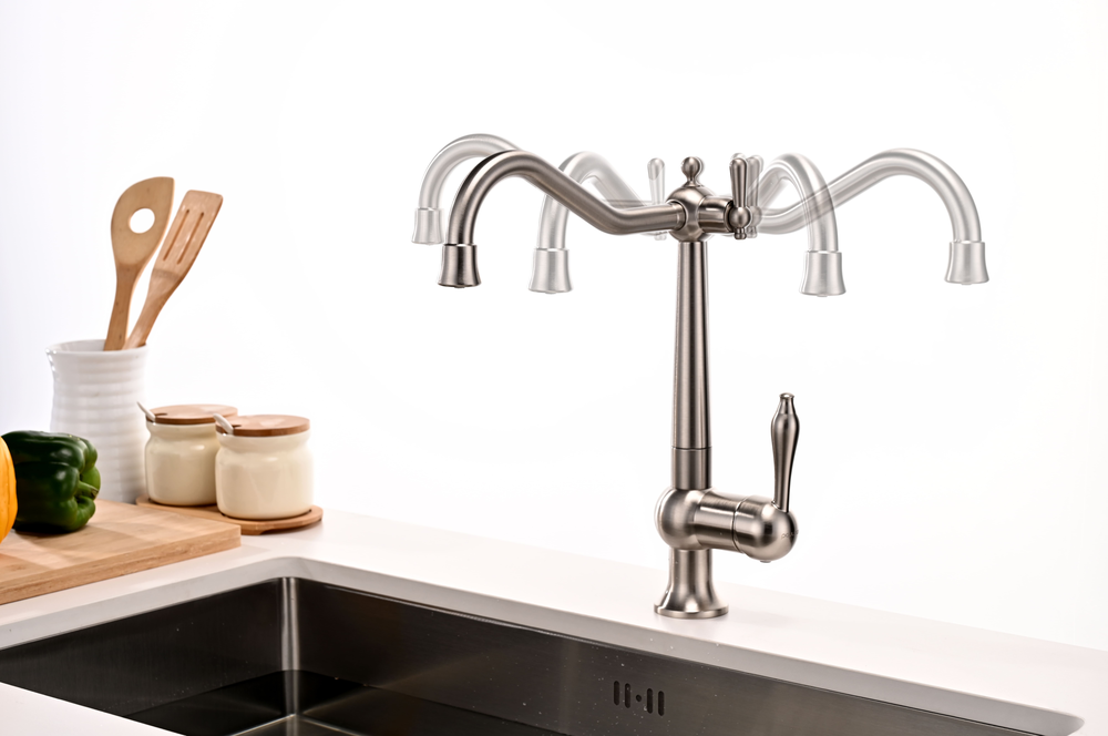 i Встроенная в кран насадка на длинном гибком шланге с металлической оплеткой. Насадки с кнопкой могут переключать обычный излив воды на душ.