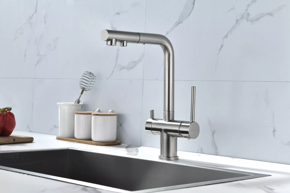 i Встроенная в кран насадка на длинном гибком шланге с металлической оплеткой. Насадки с кнопкой могут переключать обычный излив воды на душ.
