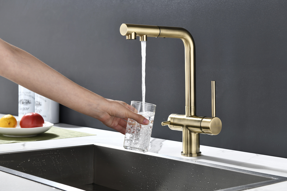 i Встроенная в кран насадка на длинном гибком шланге с металлической оплеткой. Насадки с кнопкой могут переключать обычный излив воды на душ.