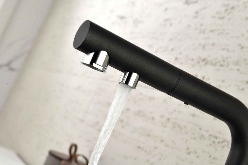 i Встроенная в кран насадка на длинном гибком шланге с металлической оплеткой. Насадки с кнопкой могут переключать обычный излив воды на душ.