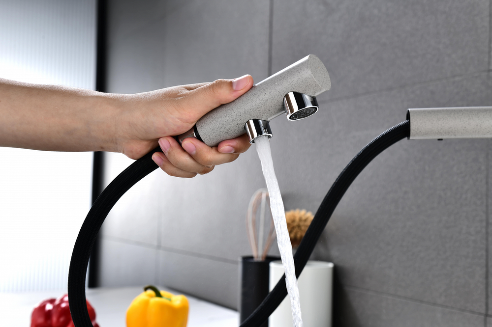i Встроенная в кран насадка на длинном гибком шланге с металлической оплеткой. Насадки с кнопкой могут переключать обычный излив воды на душ.
