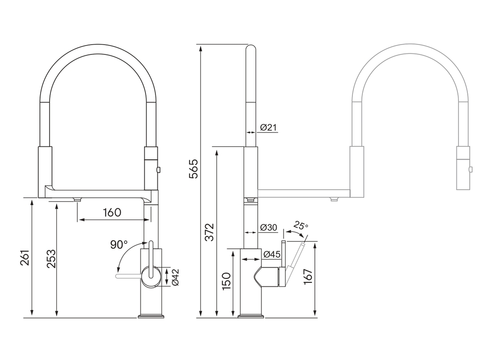 i Встроенная в кран насадка на длинном гибком шланге с металлической оплеткой. Насадки с кнопкой могут переключать обычный излив воды на душ.