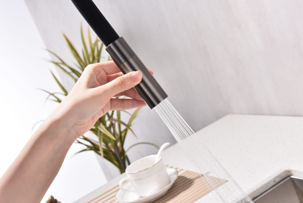 i Встроенная в кран насадка на длинном гибком шланге с металлической оплеткой. Насадки с кнопкой могут переключать обычный излив воды на душ.