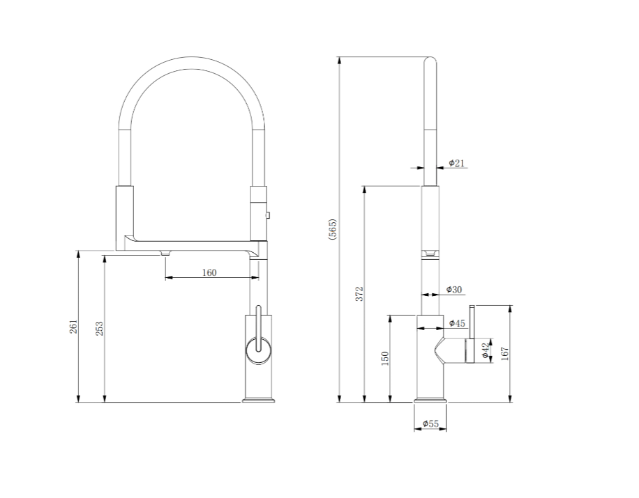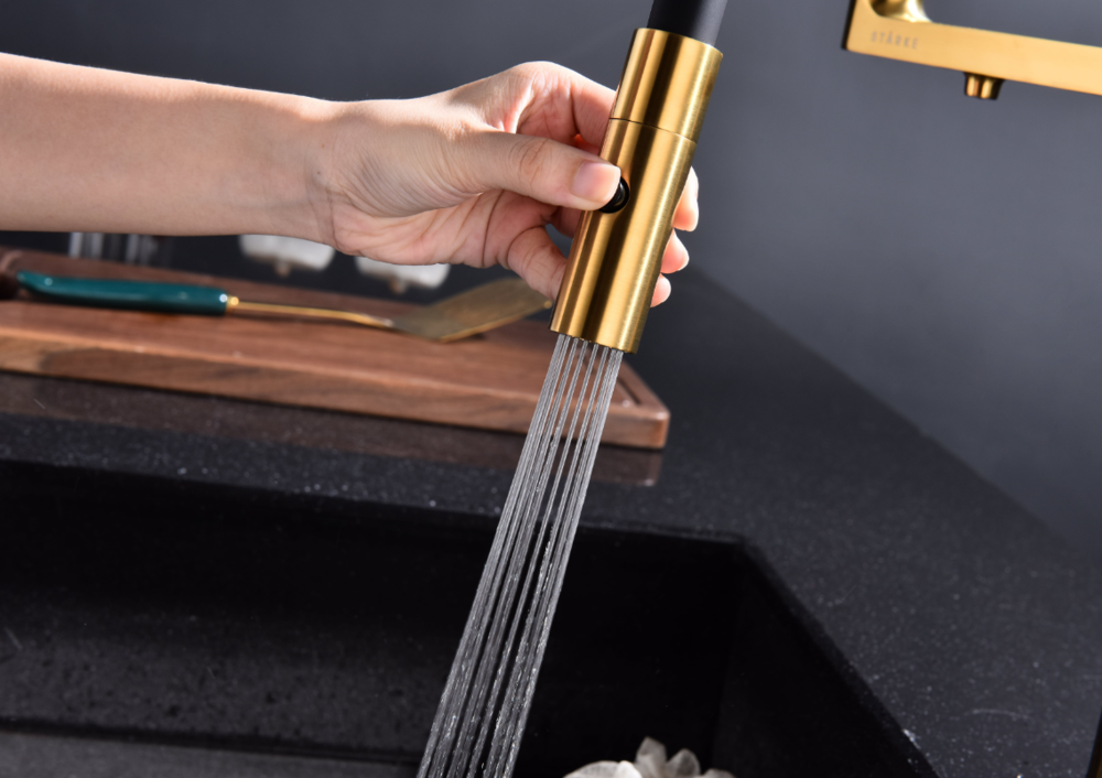 i Встроенная в кран насадка на длинном гибком шланге с металлической оплеткой. Насадки с кнопкой могут переключать обычный излив воды на душ.