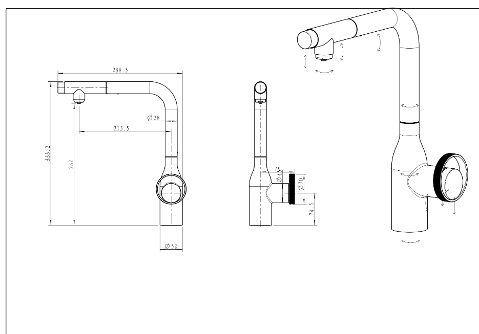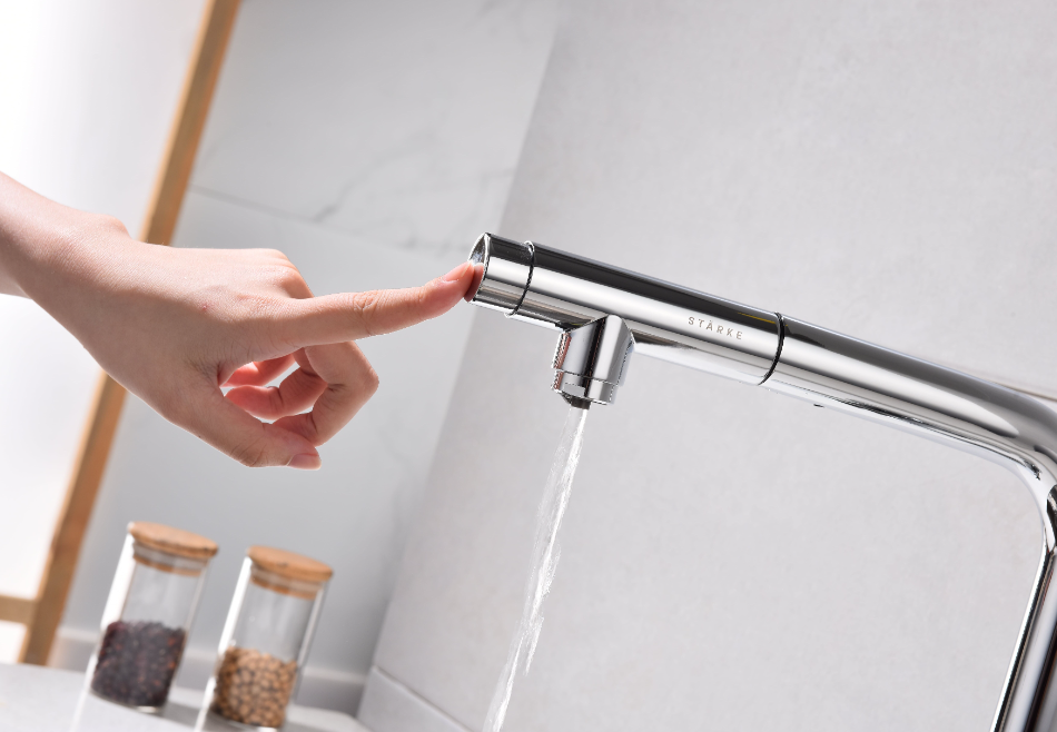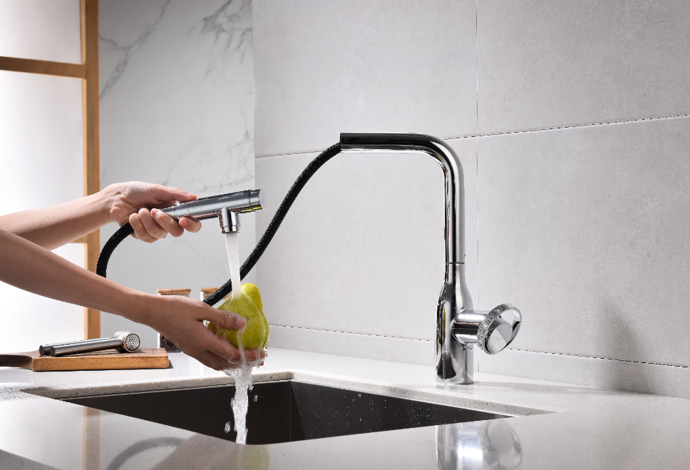 i Встроенная в кран насадка на длинном гибком шланге с металлической оплеткой. Насадки с кнопкой могут переключать обычный излив воды на душ.