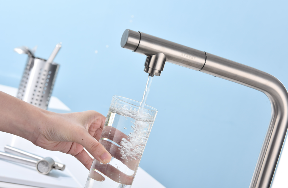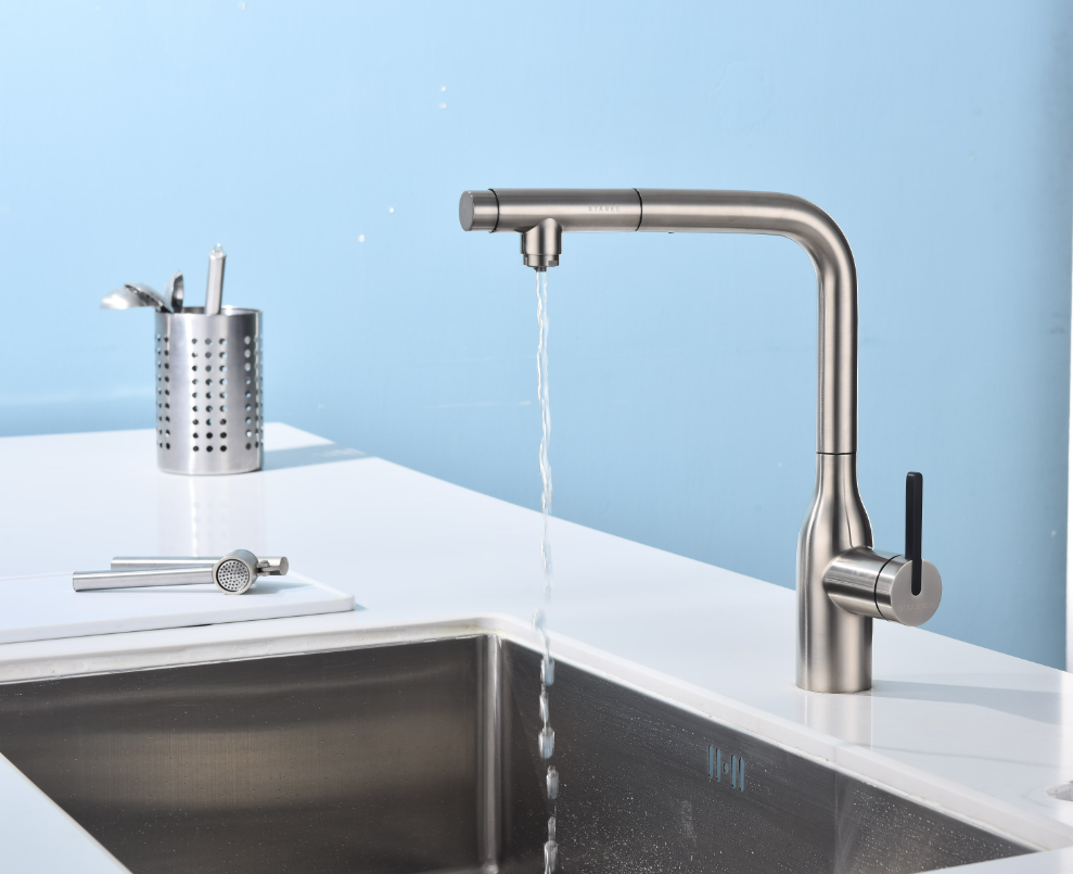 i Встроенная в кран насадка на длинном гибком шланге с металлической оплеткой. Насадки с кнопкой могут переключать обычный излив воды на душ.