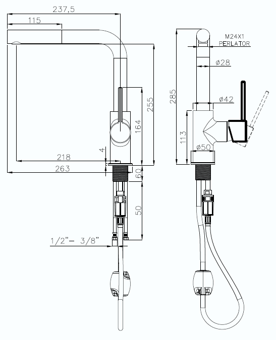 i Встроенная в кран насадка на длинном гибком шланге с металлической оплеткой. Насадки с кнопкой могут переключать обычный излив воды на душ.