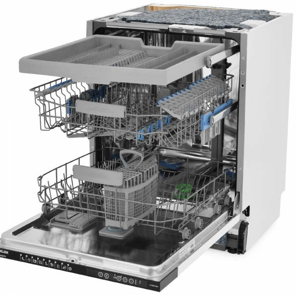 i В стандартной посудомоечной машине 3 корзины — 2 для посуды и 1 для столовых приборов. Современные модели могут иметь от 1 до 4 корзин.