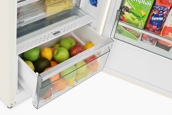 i В зоне свежести температура держится на уровне 0°С, так продукты дольше остаются свежими. Подходит для свежего мяса, рыбы, фруктов, овощей.