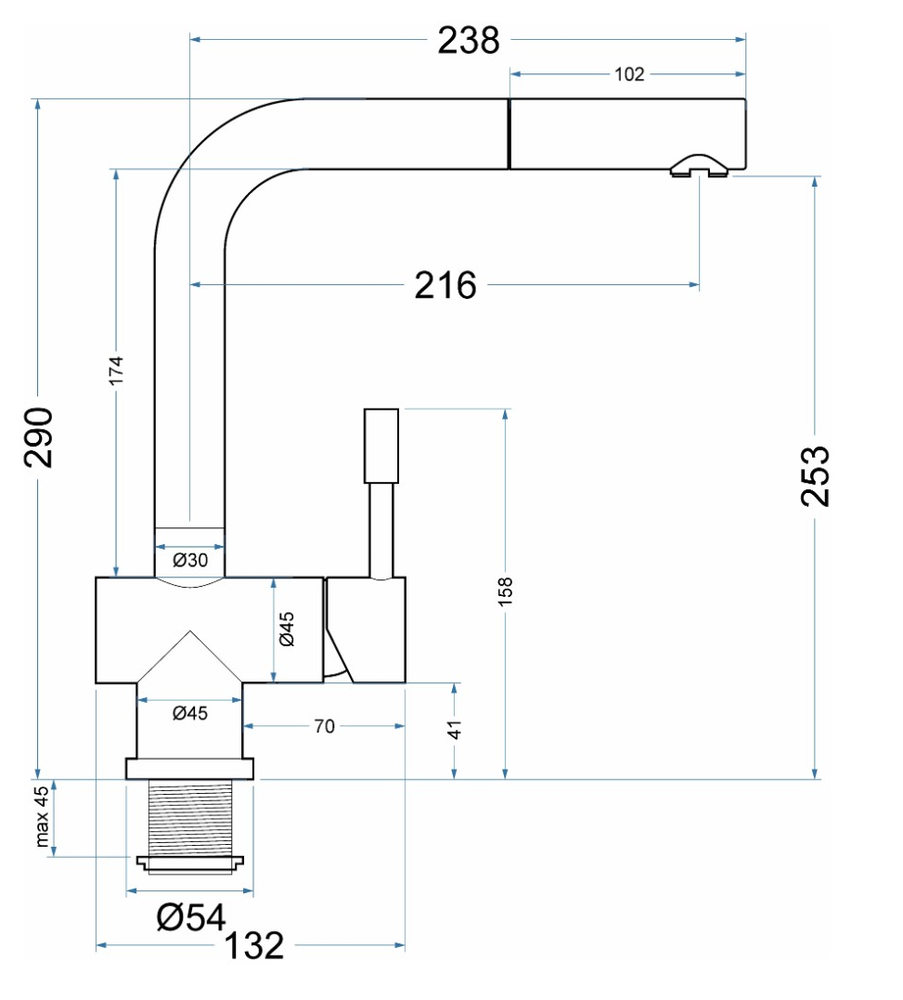 i Встроенная в кран насадка на длинном гибком шланге с металлической оплеткой. Насадки с кнопкой могут переключать обычный излив воды на душ.