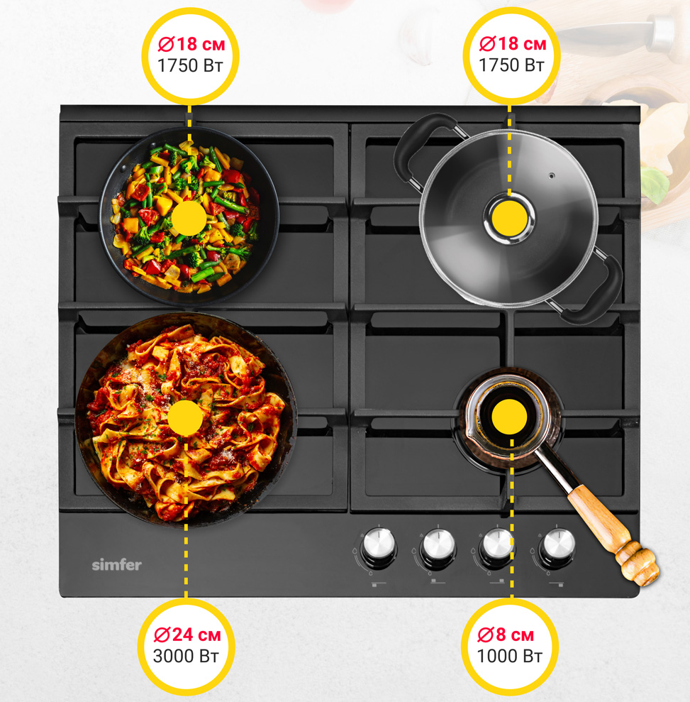 i Приборы могут имеют разное количество газовых, электрических и индукционных конфорок. Выбирайте оптимальный вариант для комфортной готовки.