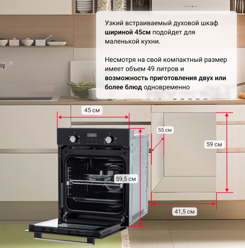 i Полезный объем камеры прибора, который может быть использован для приготовления. Духовки с объемом <50 л рассчитаны на семьи из 2-4 человек.