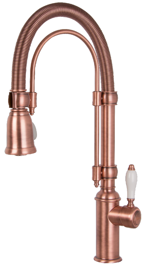 i Встроенная в кран насадка на длинном гибком шланге с металлической оплеткой. Насадки с кнопкой могут переключать обычный излив воды на душ.