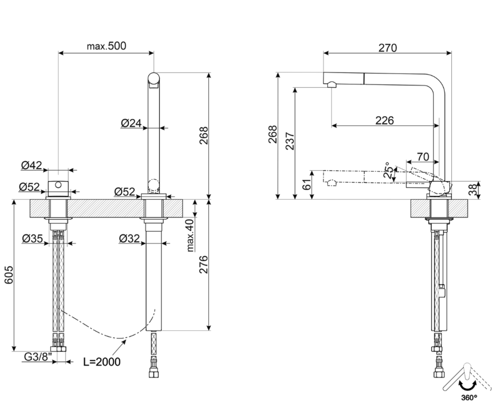i Встроенная в кран насадка на длинном гибком шланге с металлической оплеткой. Насадки с кнопкой могут переключать обычный излив воды на душ.
