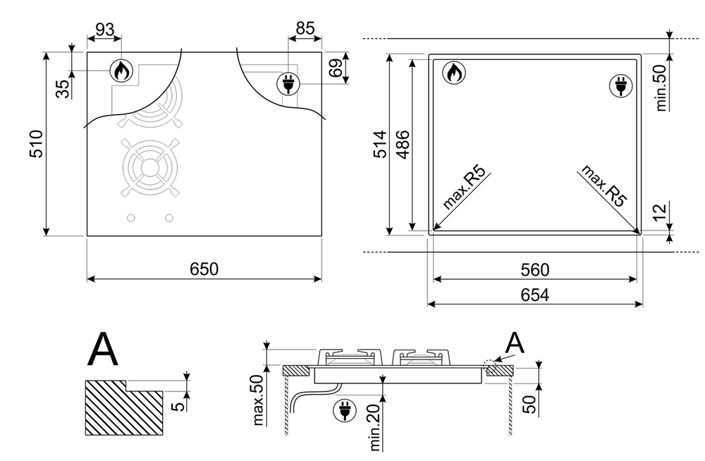 i Характер огранки фаски на внешней стороне варочной панели. Металлические рамки предотвращают забивание монтажных швов крошками и пылью.