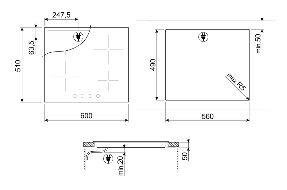i Характер огранки фаски на внешней стороне варочной панели. Металлические рамки предотвращают забивание монтажных швов крошками и пылью.