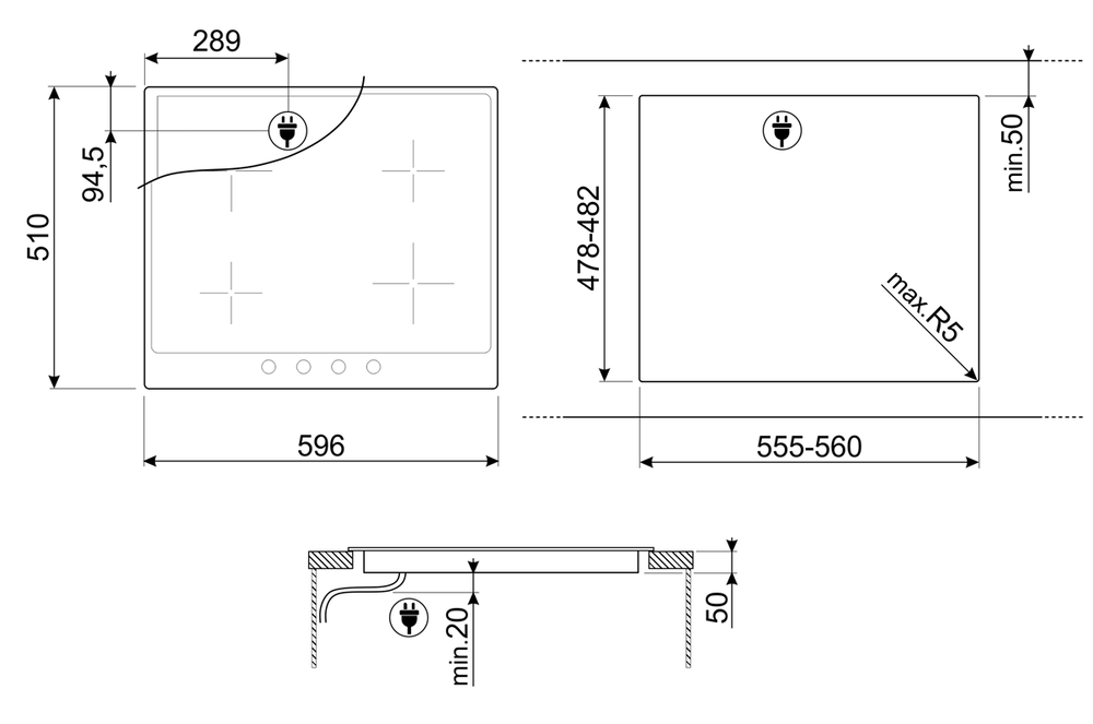 i Расположение панели управления варочной поверхностью относительно конфорок. Если панель расположена сбоку, она будет справа.