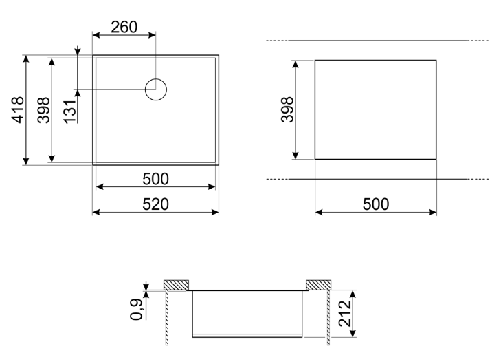 Размер выреза, установка под столешницу (мм)