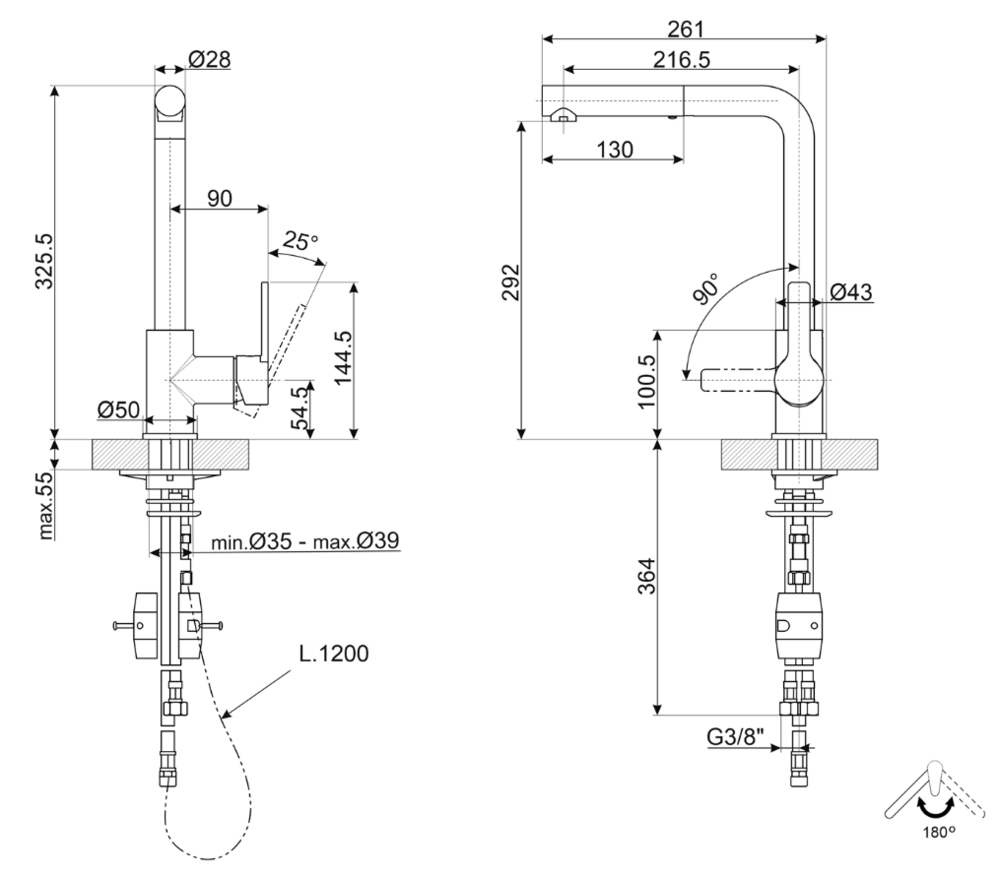 i Встроенная в кран насадка на длинном гибком шланге с металлической оплеткой. Насадки с кнопкой могут переключать обычный излив воды на душ.