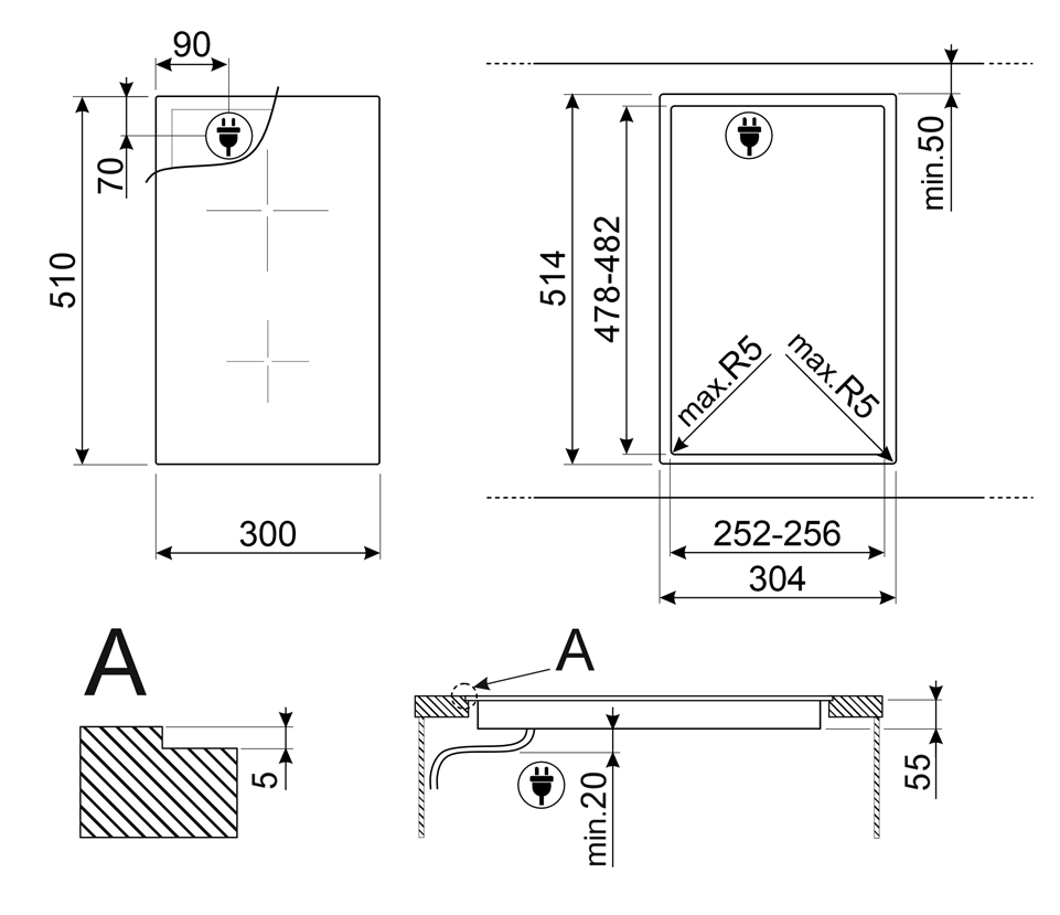 i Характер огранки фаски на внешней стороне варочной панели. Металлические рамки предотвращают забивание монтажных швов крошками и пылью.