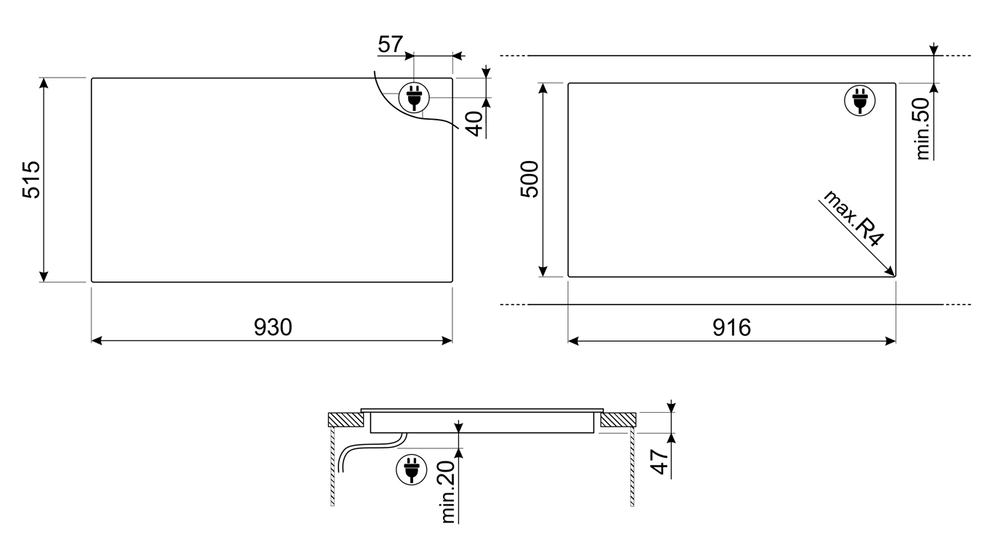 i Характер огранки фаски на внешней стороне варочной панели. Металлические рамки предотвращают забивание монтажных швов крошками и пылью.