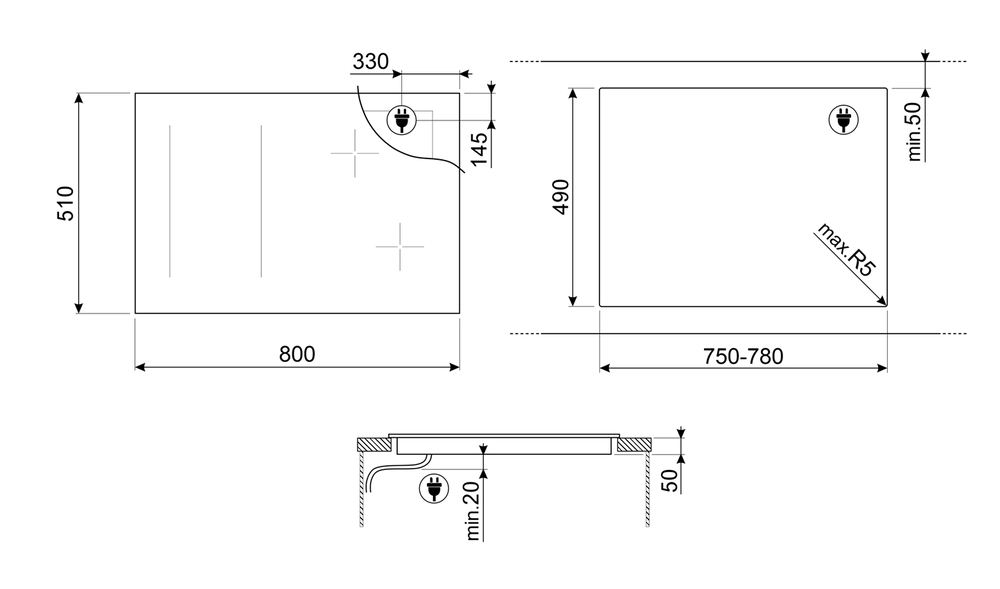 i Характер огранки фаски на внешней стороне варочной панели. Металлические рамки предотвращают забивание монтажных швов крошками и пылью.