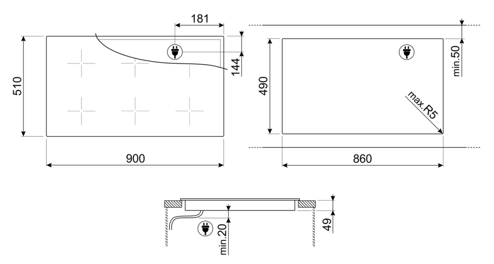 i Характер огранки фаски на внешней стороне варочной панели. Металлические рамки предотвращают забивание монтажных швов крошками и пылью.