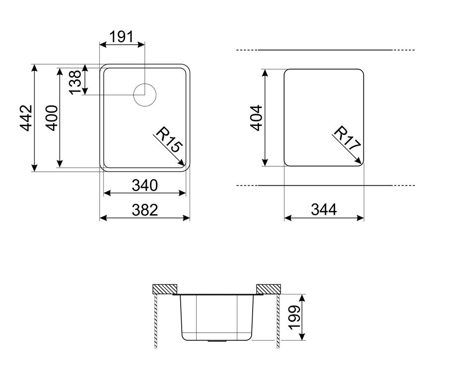 Размер выреза, установка под столешницу (мм)