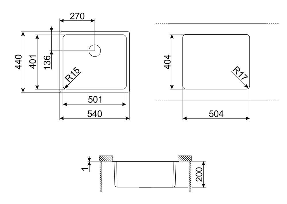 Размер выреза, установка под столешницу (мм)
